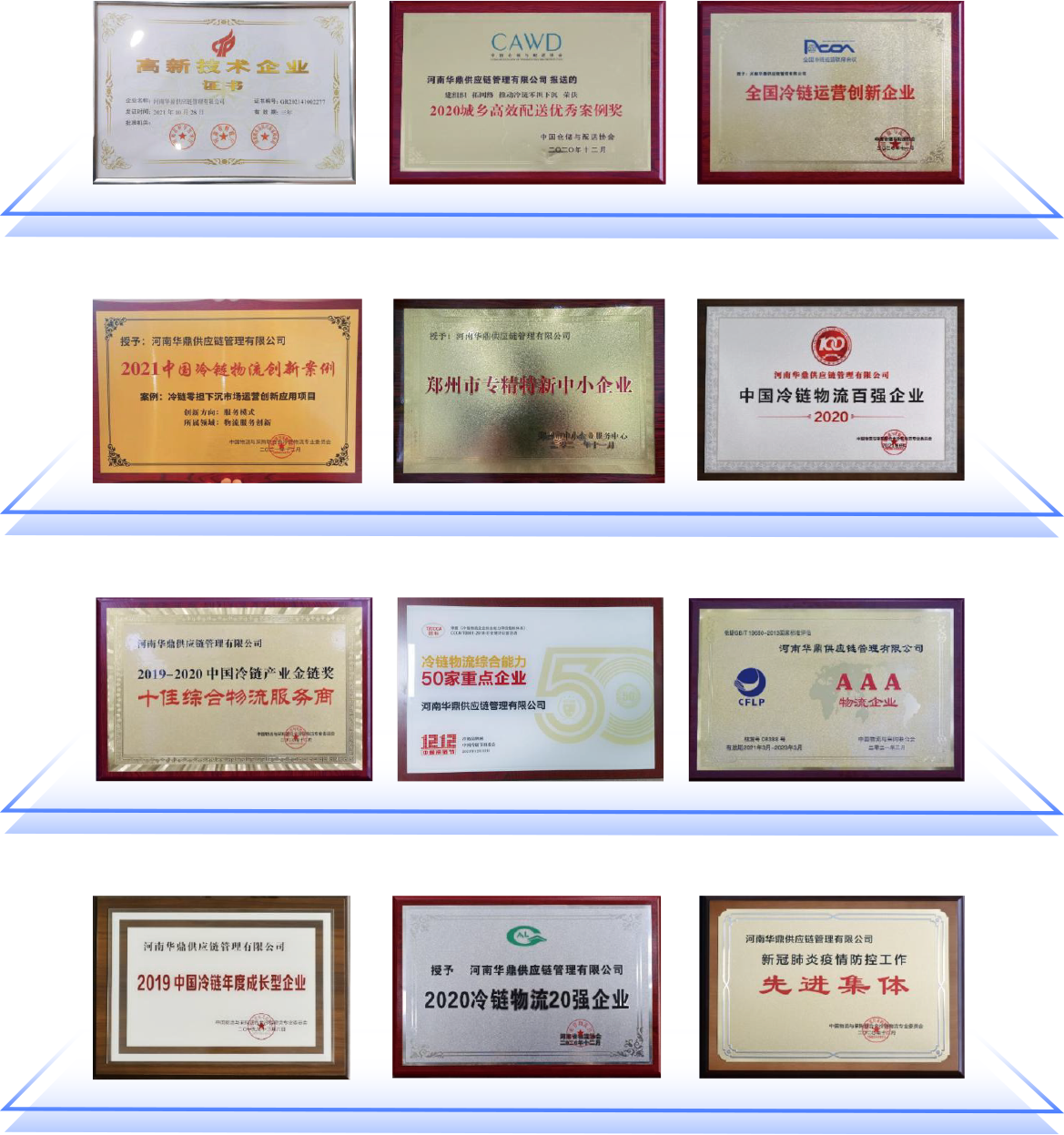 截至目前, 华鼎冷链科技在全国已经有45个省级中心仓, 仓储面积60万平方, 干支线网络125000条, 辐射全国除港澳台以外的全部省区, 290个地级市、2800个县, 通过华鼎自主研发的SAAS系统, 已连接食材工厂、连锁餐饮品牌、经销商等2500余家, 服务餐饮终端门店400000余家, 并先后荣获 “国家服务型制造业示范平台 ”、“中国冷链百强企业 ”、“高新技术企业 ”、“专精特新企业 ”、“全国冷链运营创新企业 ”、 “四星级冷链物流企业 ”、“河南省冷冻食材数字化供应链示范平台 ”等国家和行业荣誉,并参与国家城乡高效配送服务标准的制定。